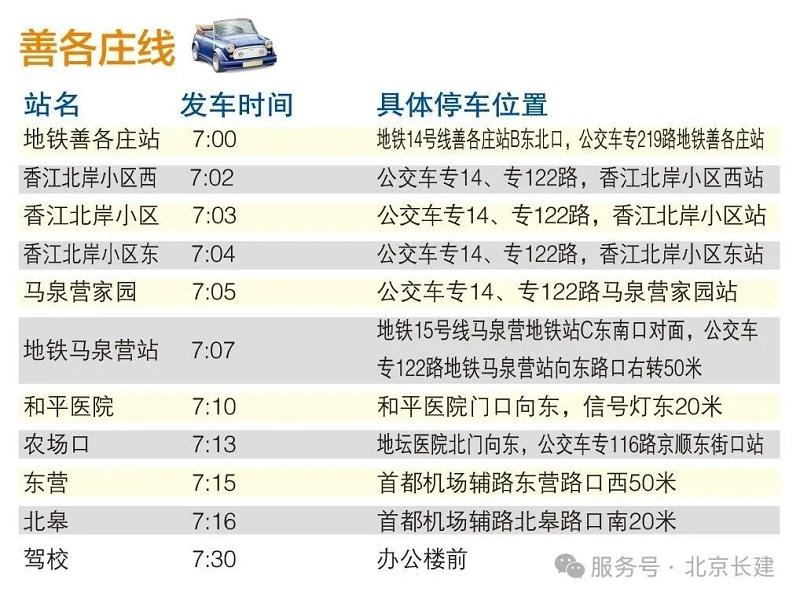 3、原7号线调整为善各庄线:每日7:00从地铁14号线善各庄东北口发车。